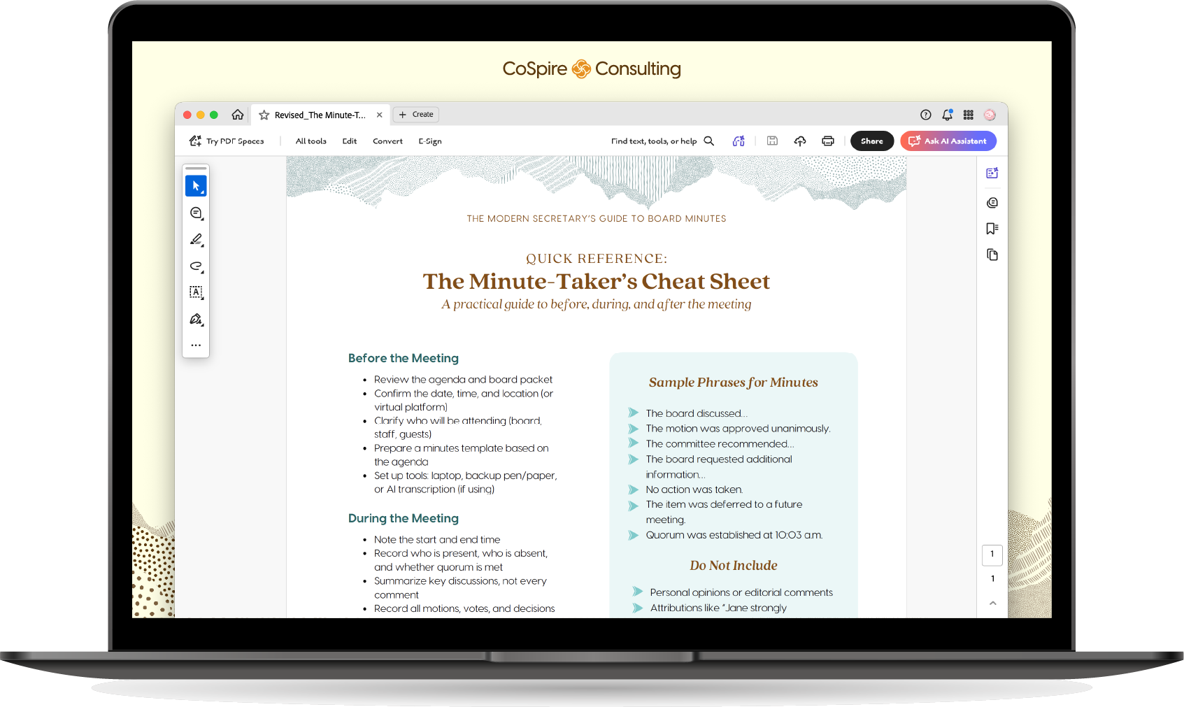 This practical resource includes a 22-page guide plus a one-page quick-reference sheet, so you can document meetings accurately without getting lost in the weeds. Whether you’re capturing decisions in person or online, it helps you stay focused on what matters most: clear records, less stress, and more trust in the process.